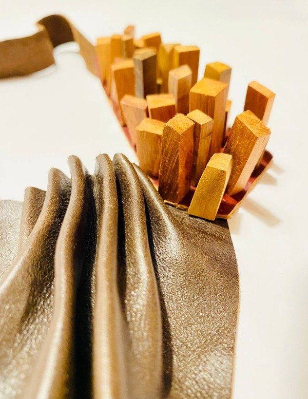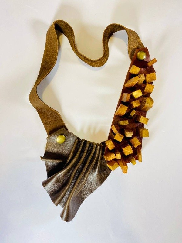 Estos accesorios están confeccionados artesanalmente con materiales reutilizados de descartes de maderas nativas y cueros de la industria del calzado local.